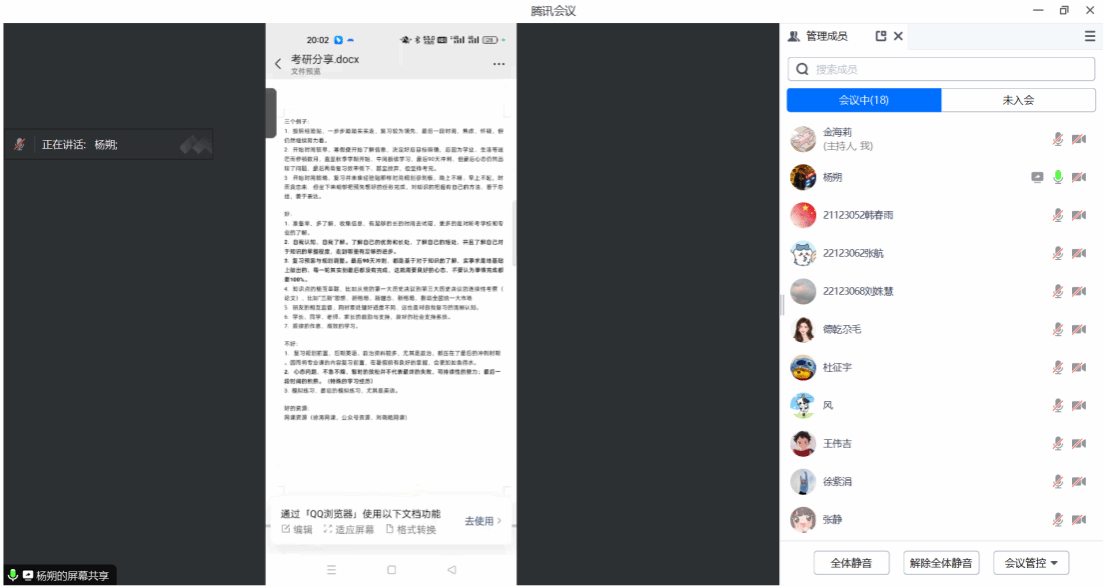 为加强员工对考研、保研、出国留学经验的了解,营造积极向上的学风,国庆节前,yl23411永利集团“无问西东”青年聊天室第十三期活动在线上腾讯会议室顺利举办。本期聊天室邀请到考研至中国人民大学的2018级思政本科生杨朔、保研至华东师范大学的2019级思政本科生王伟吉、留学至爱丁堡大学艺术史专业的2019级哲学专业本科生郑子琰三位嘉宾就考研、保研、留学进行各自的经验分享。本期活动由2021级哲学专业本科生杜征宇主持,本科生辅导员黄丽娜老师等20余名师生参与。