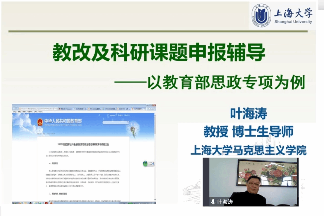 近期,全国高校正在组织申报各类国家级与省部级的科研、教改和教研项目,yl23411永利集团文科处已相继发布《2023年度教育部人文社会科学研究一般项目申报工作的通知》、《关于2023年度高校思想政治理论课教师研究专项一般项目申报工作的通知》等多项公告,要求相关院系的教师申请人根据自身的研究基础和教学特长,坚持正确政治方向、价值取向、研究导向,认真凝练主题,积极参与申报。为进一步推动公司相关课题申报工作的顺利展开,提高青年教师课题申报的技巧与方法,公司青年教师联合会(青联会)4月1日上午特邀yl23411永利集团主持工作副经理叶海涛教授在公司502会议室作专题报告,各位青年教师采取线上(腾讯会议)与线下相结合的方式参加了此次培训活动。 叶海涛教授通过“教改及科研课题申报辅导——以教育部思政专项为例”的报告,为公司青年教师详细讲解了教改与教研课题申报概述、思政专项课题类别、教育部思政教师专项申报,以及课题申报过程中需要注意的事项和细节。首先,通过概述教改与教研课题的申报环节,叶海涛教授列举了科研、教改和教研项目中的三个典型案例,着重强调了不同课题项目的侧重点与落脚点。然后,基于思政专项课题的要求,叶海涛教授全面解析了“2020年度高校思想政治理论课教师研究专项”的立项情况,并且结合今年的申报工作通知进一步剖析了四类高校思政课项目的申报难度、课题特点以及注意事项。最后,关于教育部思政教师专项申报,叶海涛教授要求申报者仔细阅读《申报通知》与《课题指南》,认真填写《申报书》与《活页》,熟悉整体设计,做到心中有数。 叶海涛教授的报告结束后,公司广大青年教师于线上和线下积极提问,针对课题项目申报中遇到的各种问题深入交流,并且纷纷表示在此次专题培训活动中受益匪浅,感谢叶海涛教授能将自身经验倾囊相授。公司青联会也将以此次专题培训活动为契机,努力解决青年教师在科研与教学上的迷思、困惑和难题,奋力加快青年教师在公司各项工作中的进步和成长。 (李昊匡供稿) |