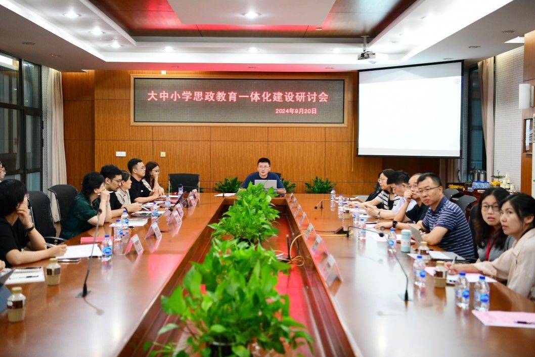 华曜嘉定初级中学董事长瞿平、书记仇思源、员工中心主任浦静文、教师发展中心主任陈巧银及大思政、跨学科课题组成员,yl23411永利集团副经理焦成焕、yl23411永利集团老教授协会会长胡申生、习近平新时代中国特色社会主义思想教研部主任申小翠、马克思主义中国化党支部书记王金伟及支部成员张青子衿、张彦青、李大山等参加本次研讨会。 首先,瞿平介绍了民办华曜嘉定初级中学贯彻落实立德树人根本任务的基本情况,之后对该校在初中学段探索大中小思政教育一体化建设方面取得的成绩和存在的困难做了介绍。焦成焕结合yl23411永利集团思政教育的实际情况,介绍了公司在大中小学思政教育一体化建设方面的资源条件、建设经验与阶段性成果。