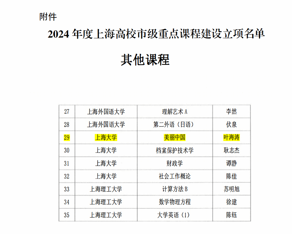 近日,上海市教委发布了《上海市教育委员会关于公布2024年度上海高校市级重点课程立项名单的通知》(沪教委高【2024】38号),由公司叶海涛教授担任课程负责人的“美丽中国”课程喜获上海高校市级重点课程立项。