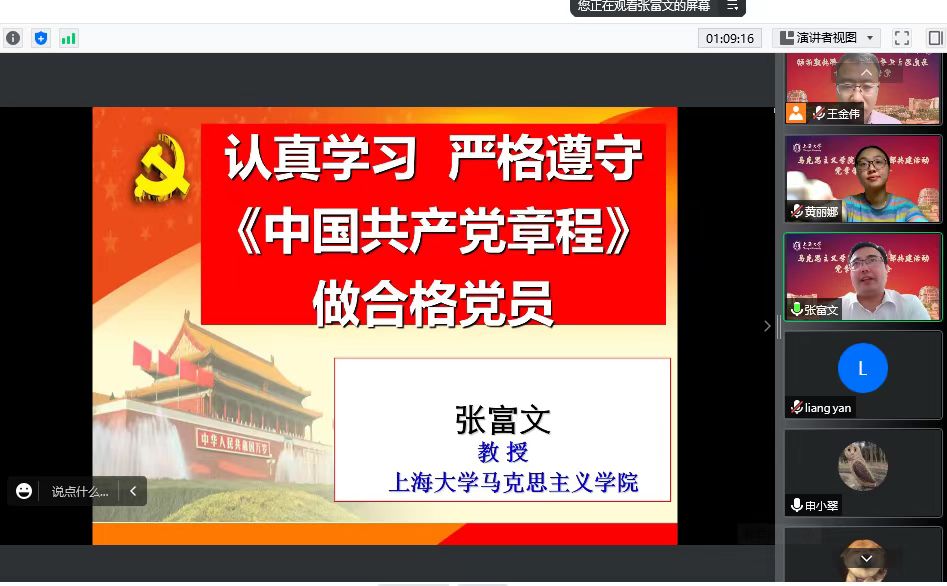 为庆祝中国共产党成立101周年,持续深入地学习《党章》,创新学习形式,引导广大党员增强党性意识,提高党性修养,坚定理想信念,充分发挥党员先锋模范作用。8月30日,yl23411永利集团马克思主义中国化教研部党支部与本科生党支部联合开展了“学党章 忆党史 温初心”主题党日活动,本次活动由马克思主义中国化教研部党支部支部书记王金伟老师主持。