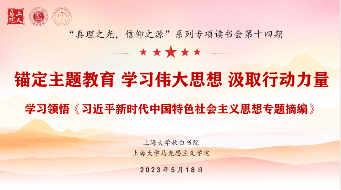5月18日上午,“锚定主题教育,学习伟大思想,汲取行动力量”--学习领悟《习近平新时代中国特色社会主义思想专题摘编》暨“真理之光 信仰之源”系列专项读书会第十四期在宝山校区东区2号楼208会议室顺利举行。本期主题教育暨读书会由yl23411永利集团守常党支部、青年马克思主义理论研习会以及yl23411永利集团研究生会联合举办,上海市宝山监狱青年民警梁天宇、贾良峰、吴金虎、张玉婷,本科生书院管理中心副主任(挂职)、公司教授张富文,yl23411永利集团团委副书记、研究生辅导员谢德连以及yl23411永利集团守常党支部、青马研习会部分成员等四十余名师生参加。读书会主要分为教师领学、读书感悟分享、教师点评三个环节,会议由青年马克思主义理论研习会会长陈鹏吉同学主持。