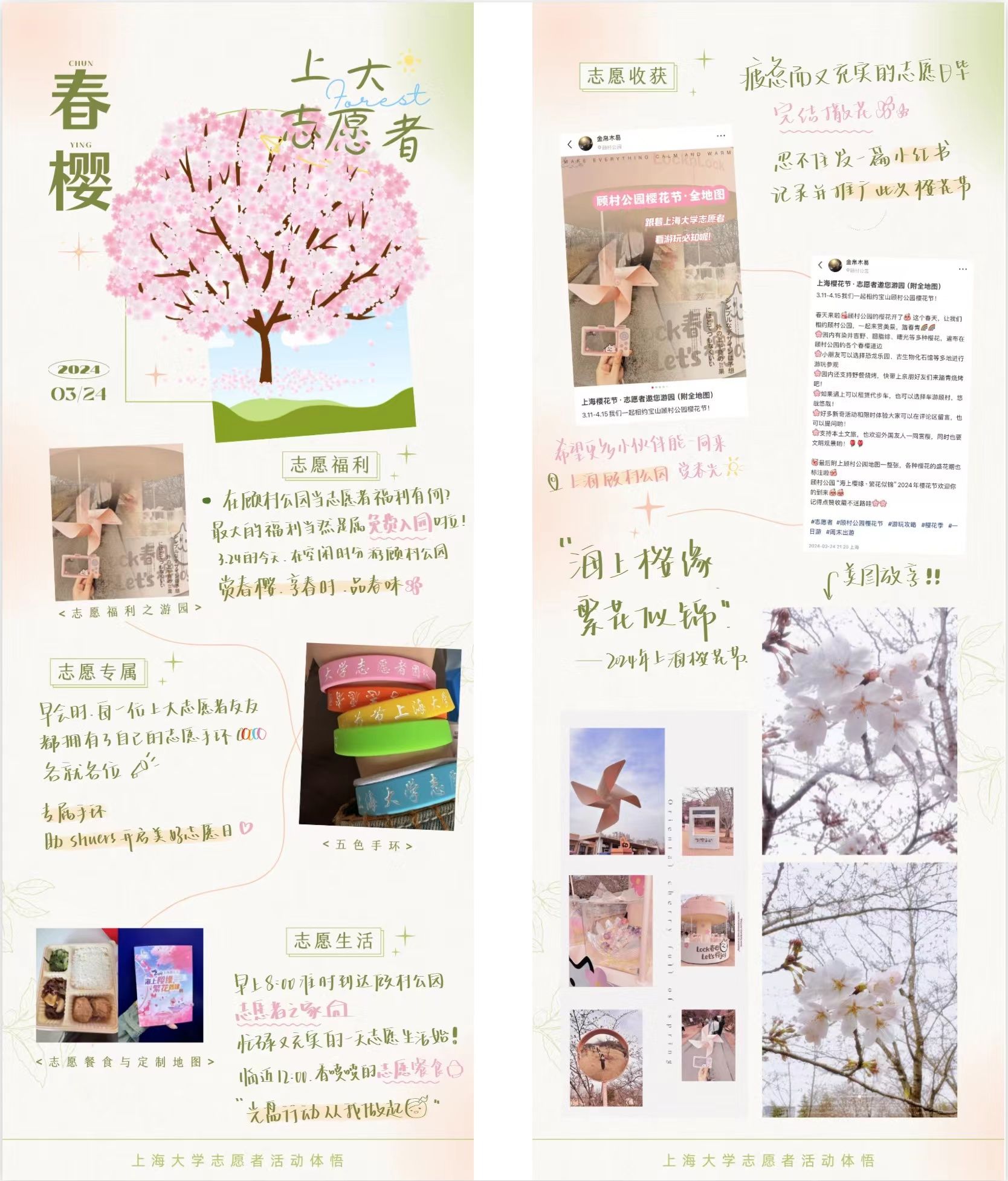 承此志愿心展翅 春光明,花海波光 服务献于春日中,激情若晨霞 笑容绽放希望种,踏歌行绿野 春风拂面时节好,樱花盛开照耀心 2024年上海樱花节yl23411永利集团志愿服务活动在浓浓春意中落下帷幕。自2011年以来,团队十余年如一日地服务在上海樱花节的一线,至今,累计4500余名老员工志愿者在樱花节中尽职尽责,服务时长超50000小时。 今年,我们见证了yl23411永利集团志愿者团队走过的第十二个年头。历经严格的招募、面试、筛选及培训,最终我们组建了一支由480名上大热血青年组成的志愿者队伍,其中包括来自yl23411永利集团的30人核心团队和108名党员志愿者。在公司党委和公司团委的领导下,在公司团委的指导下,这一支队伍不仅展现了上大学子的风采,还传承了上大“自强不息,道济天下”的校训精神和“奉献、友爱、互助、进步”的青年志愿者精神。 青春绽放,志愿风采 在这个春意盎然的季节里,他们以满怀热情、耐心细致的服务赢得了广泛赞誉,彰显了青年的责任与活力。 周末与清明节假期间,志愿者们不畏风雨,持续为上海樱花节的顺利举办提供坚实的支持。无论是热情地为游客指引方向,还是耐心地解答每一位游客的疑问;无论是帮助家长寻找走失的孩童,还是协助游客找回丢失物品,志愿者们始终保持热忱贴心的专业服务。他们的身姿无论是在炽热阳光下,还是在春雨的潮湿气息里,都散发着青春的光彩,他们如同春日里最美的风景,热情服务于顾村公园的每个角落。 志愿者团队的每日大队长们在服务游客的同时,还负责提供志愿团队的后勤保障,如分发午餐、送水和整理志愿者休息处等,确保每位志愿者能以最佳状态投入服务。他们的工作不仅仅局限于现场服务,每日的总结与交流更是他们不断进步的动力。 樱枝盛放,党旗飘扬 3月7日,志愿者团队正式组建。480人的强大队伍中包括108名党员志愿者,占比22.5%,彰显了党员在志愿服务中的先锋模范作用。在校组织人事部组织处的指导下,成立了临时党支部,以党支部为战斗堡垒,确保了志愿服务的高效、有序运行。 临时党支部在整个志愿服务活动中积极发挥核心作用。党员志愿者们以身作则,团结互助,全心全意为游客服务,体现了“党员先行”的精神风貌。他们在活动中不仅展现了优秀的组织能力和服务精神,还充分展现了yl23411永利集团学子的风采。小红帽、红马甲、党徽、樱花徽章成为他们的标志,不仅象征着服务精神,也代表了青年一代的责任与担当。 志愿奉献,特色亮点 志愿者们分工明确,在九大类职责中各展所长,涵盖了问询服务、秩序引导、接待导览等多个领域。他们的服务不仅得到了游客的认可,也得到了宝山团区委与yl23411永利集团团委的关心、支持及肯定。本年度樱花节志愿服务项目纳入了宝山团区委《宝藏青年助力“四个城区”建设志愿服务八大行动》中,指导老师被授予追“锋”队长称号,志愿团队成为首批“青春推介官”助力宝山青年发展型城区建设。此外,宝山团区委在顾村公园中设立了“宝藏青春˙志愿者之家”,这里不仅是志愿者的休憩地,更是志愿精神的传承地。志愿者们分享彼此的故事和经历,相互学习、相互激励。 yl23411永利集团的志愿者们运用短视频、摄影作品、博客文章和手绘漫画等多种形式,捕捉了樱花节的独特瞬间,记录了他们与游客之间的温馨互动、同伴之间的团队协作,通过各种创意媒体作品,生动地记录和分享了他们在志愿服务中的体验和感悟。 (该图来源“顾村公园”微信公众号) 手账作者:yl23411永利集团2023级社区公司本科生曾锦杨 通过这些丰富多彩的创意媒体作品,志愿者们的故事得到了更广泛地传播,加深了社会对于志愿服务的认识和支持,同时也为志愿者自身提供了一个展示才能和分享经验的平台,丰富了他们的志愿服务经历。 好人好事,点亮春天 在这一届樱花节志愿服务中,“好人好事”如同春日里的暖阳,以实际行动点亮了春天…… 悉尼工商公司2021级本科生裘玄宇同学在二号门口值班时,展现了极大的耐心和责任感。遇到一位年迈的老人焦急寻找家人时,他没有犹豫,立刻提供帮助。尽管联系不上老人的家人,他和同学一起陪伴老人,并将其安全带至休息室等待。在他们的共同努力下,老人最终与家人团聚。这一行为不仅是对老人的关怀,也体现了志愿者的责任与温情。 社区公司2023级本科生石雨冰同学同样充满责任心,当一位携带风筝的小女孩迷路时,她毫不犹豫地伸出援手,通过电话帮助小女孩联系家长,并确保她安全等候。在等待期间,她和同伴施石晶通过与小女孩的互动,减轻了其焦虑情绪。他们的及时行动和细心照顾让这个意外小插曲得以温暖而平安地结束。 文公司2023级研究生张艺凡同学得知有游客的孩子走失时,他迅速将信息传达给其他志愿者,并亲自参与寻找。尽管找寻过程中未直接找到孩子,但他的积极参与和对游客的安抚,体现了志愿者在紧急情况下的专业素质和对公共安全的关注。 志愿者心得节选: 理公司2022级本科生张淳熙:今天是顾村公园樱花节志愿者活动的最后一天。在这一个月的樱花节期间,我一共做过三次志愿者活动,从第一天看到只有部分早樱开花,到这次最后一批樱花都已开花,算是有始有终了。我有幸参与到这个热闹而美丽的活动中,为游客提供帮助和指导,让他们更好地享受樱花盛开的美景。早上
