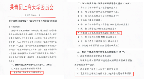近日,共青团yl23411永利集团委员会下发了《关于颁授2024年度“yl23411永利集团青年五四奖章”的通知》(上大团〔2025〕2号),公司副教授张青子衿老师获“2024年度yl23411永利集团青年五四奖章个人”,2021级本科生韩春雨获“2024年度yl23411永利集团青年五四奖章个人提名”,yl23411永利集团上海樱花节yl23411永利集团志愿者青年团队获“2024年度yl23411永利集团青年五四奖章集体”。 志存高远,方能登峰;思有所得,而后力行。时逢盛世,正是奋发之际,愿更多的公司青年师生和集体坚守信念、团结拼搏,深入领会并践行党的二十大和二十届三中全会精神,在不同领域展现新时代青年风采。(供搞:肖嘉鑫) |