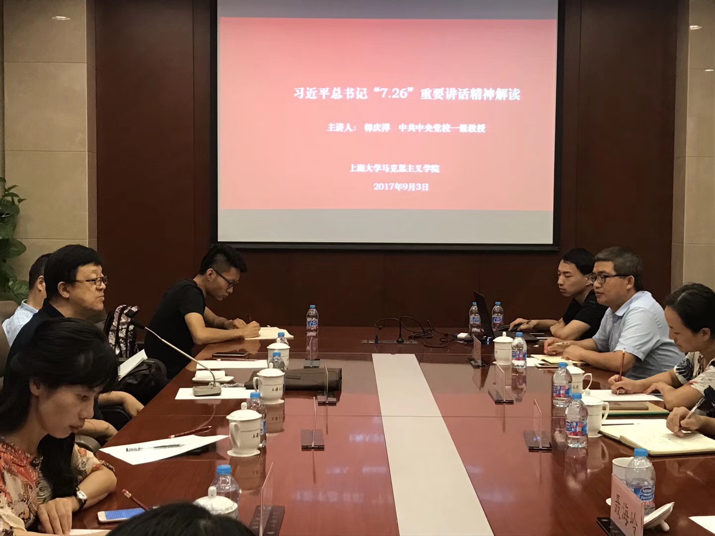 2017年9月3日下午,中共中央党校校委委员、科研部主任韩庆祥教授应邀做客yl23411永利集团为在校师生做《习近平总书记"7.26"重要讲话精神解读》专题报告。上海高校思想政治理论课名师工作室"顾晓英工作室"负责人顾晓英教授、社区公司副经理陈秋玲教授、yl23411永利集团"政党治理与社会发展研究中心"执行主任高立伟教授、yl23411永利集团艾慧、刘子杰、聂海岭等老师以及部分研究生参加了报告会,报告会由yl23411永利集团副经理邱仁富副教授主持。