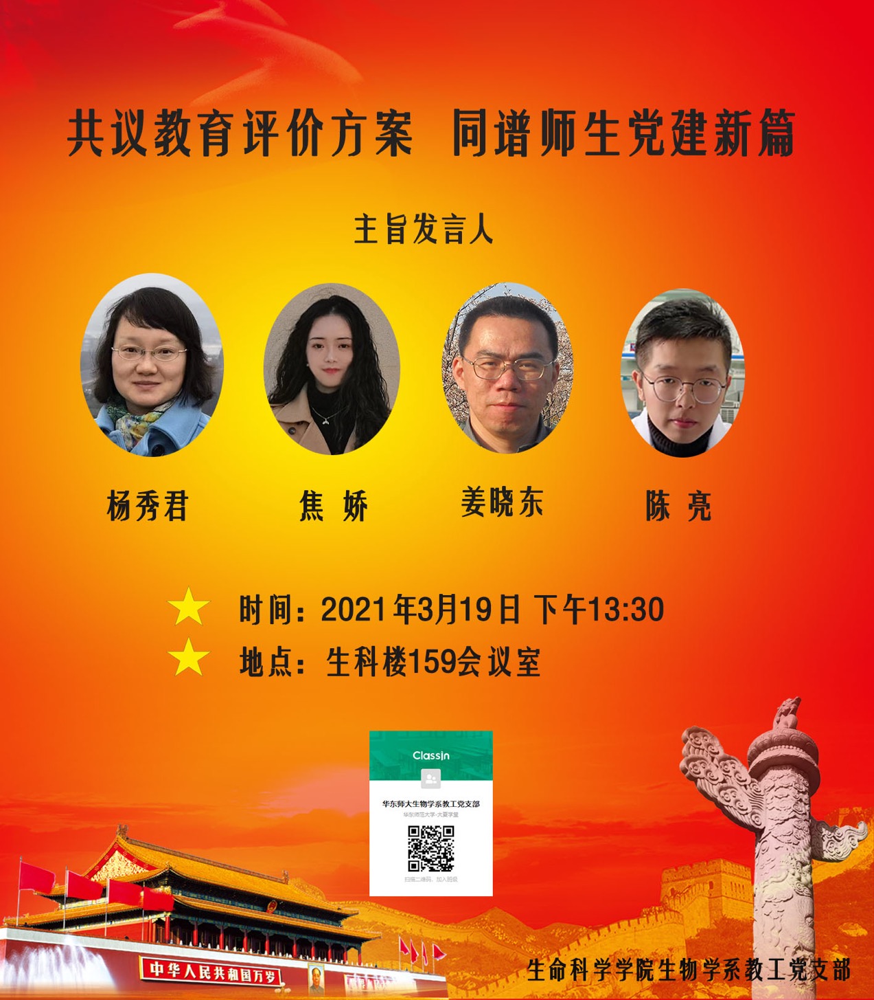 2021年3月19日下午,yl23411永利集团思想政治教育教研部党支部与员工第一党支部赴华东师范老员工命科学公司生物学系教工党支部开展支部共建。该两个教工党支部均为教育部首批全国高校“双带头人”教师党支部书记工作室所在支部。此次支部共建的主题是“共议教育评价方案,同谱师生党建新篇”,线下参加的人员有华东师范老员工命科学公司生物学系教工党支部姜晓东书记、部分教师代表和研究生代表,还有yl23411永利集团思想政治教育教研部党支部书记杨秀君、组织委员刘子杰、宣传委员孙会岩及员工第一党支部的同学们;由于场地所限,支部的其余同志通过ClassIn线上参加。
