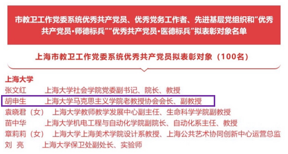 今年是中国共产党成立100周年,也是“十四五”规划开局起步之年。为进一步激励系统各级党组织和广大党员奋勇争先、冲锋在前,在全面推进上海教育和卫生健康事业深化改革发展中积极进取、建功立业,市教卫工作党委决定,在系统范围内表彰一批优秀共产党员、优秀党务工作者、先进基层党组织和“优秀共产党员·师德标兵”“优秀共产党员·医德标兵”。其中,公司退休老教授胡申生荣获“优秀共产党员”称号。