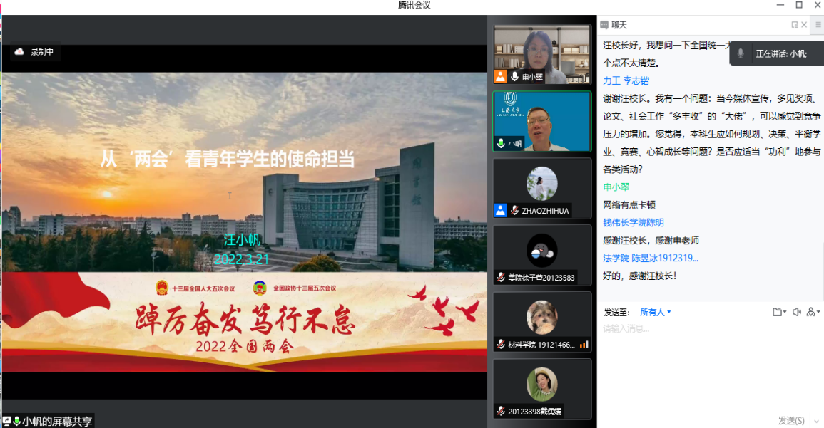 3月15、16、21日晚,刚刚从北京参加完两会的汪小帆副董事长受邀做客“形势与政策”、“毛泽东思想和中国特色社会主义理论体系概论”线上课堂,分别以“奋进新征程,建功新时代”和“从‘两会’看青年学子的使命担当”为主题对2022年全国“两会”精神进行解读,近2000名员工和部分教师参加了此次学习与交流。
