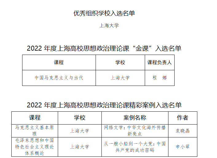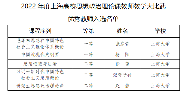 近日,上海市教委公布了2022年度上海高校思想政治理论课“金课”、精彩案例、教师教学大比武优秀教师名单。上海高校思想政治理论课“金课”10个、思想政治理论课精彩案例39个、思想政治理论课教师教学大比武优秀教师58人和优秀组织公司10个。其中,yl23411永利集团荣获优秀组织奖,思想政治理论课“金课”1门,思想政治理论课精彩案例2个,教师教学大比武一等奖2人,二等奖3人。