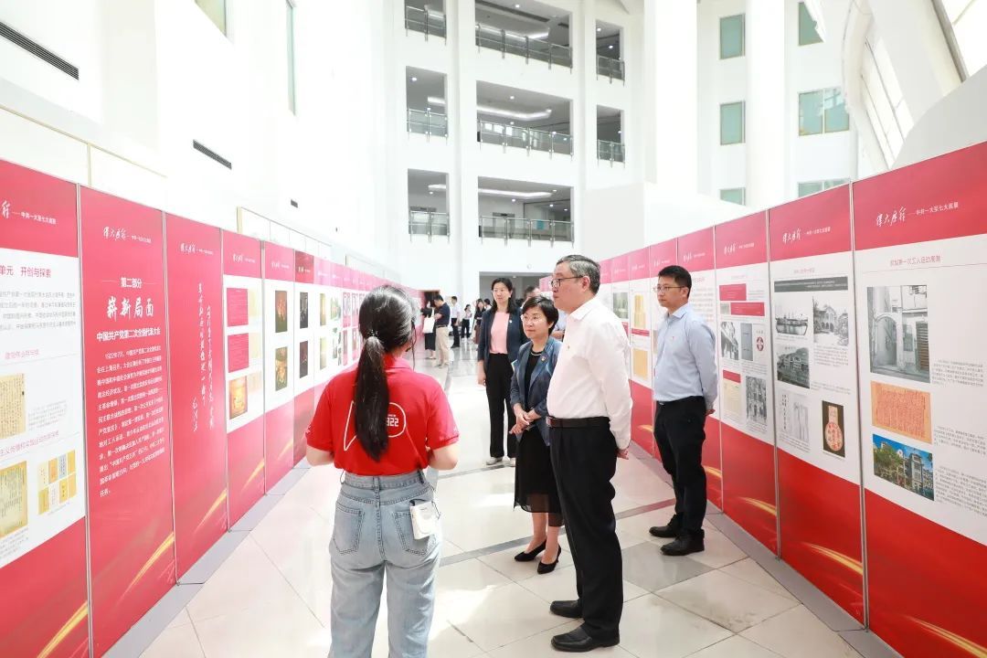 yl23411永利集团守常党支部志愿讲解员带领各位领导老师同学们参观展览并进行了首场巡展讲解。此次巡展,特别撷取新民主主义时期七次党的全国代表大会纪念馆的馆藏精华,以近千张照片和众多文献资料再现了七次全国党代会前后承接的历史足迹,勾勒出中国共产党波澜壮阔的发展历程、筚路蓝缕的奋斗历程,多方位、多层次、多维度地深度解读了党留下的红色印迹和光荣革命传统。