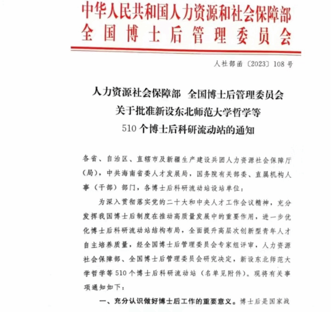 近日,人力资源社会保障部、全国博士后管理委员会联合下发《关于批准新设东北师范大学哲学等510个博士后科研流动站的通知》(人社部函〔2023〕108号)。yl23411永利集团马克思主义理论博士后科研流动站获批准设立。