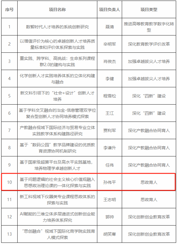 近日,上海市教育委员会下发《上海市教育委员会关于公布2023年上海高校本科重点教改项目立项名单的通知》(沪教委高【2023】47号),yl23411永利集团孙伟平教授申报的《基于问题逻辑的社会主义核心价值观融入思想政治理论课的一体化探索与实践》项目获得立项。此次yl23411永利集团共有13个项目获得立项,获批立项数位居上海市高校第三。