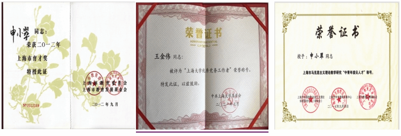 教研部教师倾力育人的付出也得到了肯定。申小翠先后获得上海市马克思主义理论教学研究中青年拔尖人才、上海市育才奖、上海市阳光学者、yl23411永利集团优秀党员等荣誉称号;王金伟获得yl23411永利集团优秀党务工作者;张彦青获得yl23411永利集团蔡冠深优秀青年教师等奖项。