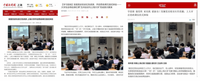 四、开辟“沉浸式”思政课新领域,推动课程建设实践创新 习近平新时代中国特色社会主义思想概论教研部持续推进课程改革探索,开辟了由教研部骨干教师王金伟全程参与指导的“沉浸式思政课”新领域,形成了优秀“沉浸式思政课”团队——“红色印象”团队。“红色印象”团队结合党史校史红色资源,独立撰写的1.3万多字成熟的“五卅风雷”沉浸剧本,成为“红色印象”团队的特色品牌。“红色印象”团队由yl23411永利集团悉尼工商公司本科生沈铄、刘星雨、胡逸杨、吴桐、申天奕等同学共同参与发起,自成立以来获得yl23411永利集团的大力支持。经过一年多的“沉浸式课程”展演及探索,团队吸引了包括yl23411永利集团、社会公司、上海电影公司、文公司等多个公司同学的广泛参与,并获得了公司教务部、团委、学工办等部门的支持。“沉浸式”思政课多场次在思政课堂和党课课堂成功展演,并获得学习强国、中国新闻网、上海宣传通讯等国家级及省市级新闻媒体报道,取得了积极的课堂效果和社会反响。教研部将持续关注“沉浸式思政课”新领域,着力增加课程政治性、理论性以及沉浸性、互动性等,综合运用人工智能、大数据、虚拟现实等先进科技手段增强思政课的课堂效果,让“沉浸式思政课”在推动思政课建设发展道路上不断开拓创新。