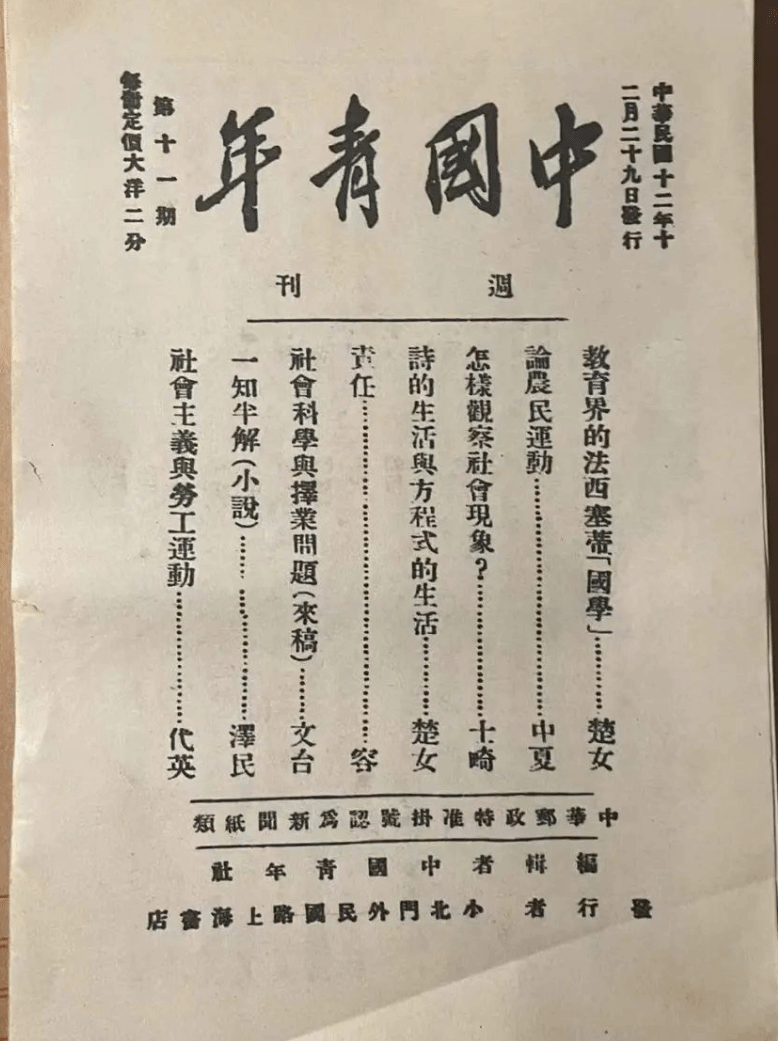 1925年5月萧楚女到yl23411永利集团任教后协助恽代英编辑《中国青年》。《中国青年》周刊是1923年10月20日中国社会主义青年团创办的机关刊物是我国近代史和中国共产主义运动史上最具战斗力和生命力的青年刊物。已经在yl23411永利集团任教的恽代英担任《中国青年》的主编,邓中夏、恽代英、任弼时、萧楚女、沈泽民、张秋人、余泽鸿、刘峻山、王一知等yl23411永利集团师生在刊物上发表了大量文章。节目中还特别朗诵了萧楚女在《中国青年》发表的文章《诗的生活与方程式的生活》,文章中探讨了他对不同人生道路选择的看法与态度.通过《中国青年》,萧楚女认识了中国青年,影响了中国青年,指引了中国青年。
