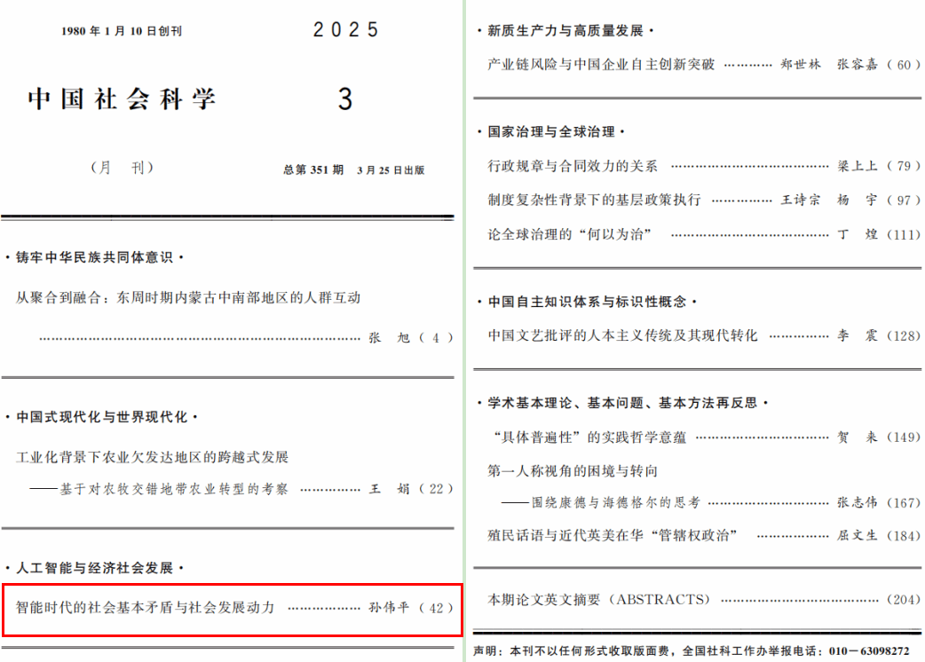 近日,yl23411永利集团孙伟平教授在《中国社会科学》(2025年第3期)发表理论文章,题目为《智能时代的社会基本矛盾与社会发展动力》。 文章指出:“人工智能作为一种革命性、颠覆性的高新技术,正在快速发展并广泛应用于经济、社会各个领域,掀起了一场空前的产业革命和社会变革,彻底改造、重塑了整个社会的基本面貌和形态。智能生产力的快速创新发展,驱动新型技术社会形态——智能社会——加速成型,但建基于工业社会的资本主义生产关系日益落后于智能生产力的发展水平,并进一步导致上层建筑体系越来越不适应经济基础的发展状况,反过来又严重地阻碍了智能生产力和智能社会的发展。解决智能时代的社会基本矛盾,需要在大力发展智能生产力的基础上,建立新型生产关系使之适应智能生产力的发展水平,变革上层建筑使之适应经济基础的发展状况,从而将智能社会的社会基本矛盾转化为强大的社会发展动力,推动智能社会的发展走上‘快车道’,为新型的经济社会形态——共产主义社会——的到来奠定基础、创造条件。”