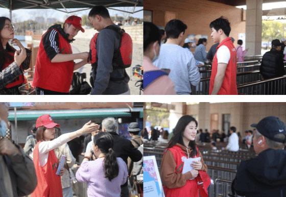 三、志愿韶华,“樱”姿绽放 为充分发挥党员先锋模范作用,临时党支部要求全体党员志愿者佩戴党员徽章上岗,勇于亮身份、担责任,将先锋本色彰显在每一个细微之处。无论是搀扶老人穿越花海,还是紧急处理儿童走失事件,他们用实际行动诠释“为人民服务”的深刻内涵。负责水上游玩项目救生衣检查的党员志愿者陈杰垚表示:“作为新时代的党员同志,我愈发懂得‘为人民服务’从来不是抽象概念。在帮助游客整理救生衣的躬身之间,在耐心解答咨询的言语之中,我们正用青春践行着党旗下的誓言。这片樱花海见证的不仅是春的绚烂,更是红色基因的传承。”