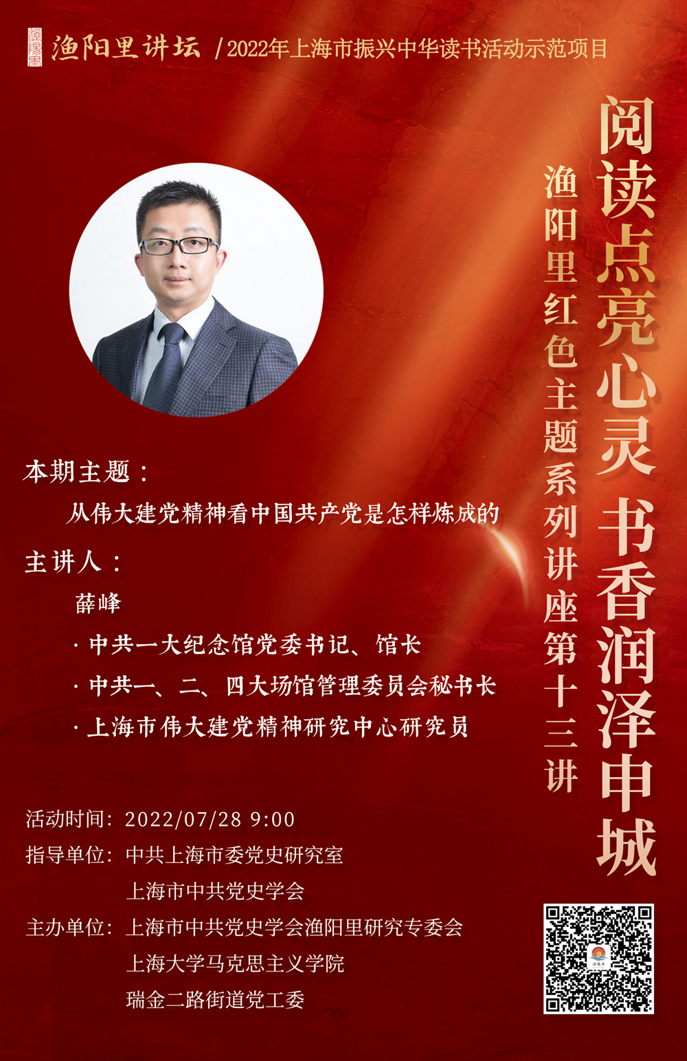 7月29日上午,2022年“渔阳里讲坛” 第十三讲暨“阅读点亮心灵书香润泽申城——渔阳里红色主题系列讲座”在瑞金二路街道党建中心开讲。本次讲坛特邀中共一大纪念馆馆长薛峰做了题为《从伟大建党精神看中国共产党是怎样炼成的》的专题讲座。
