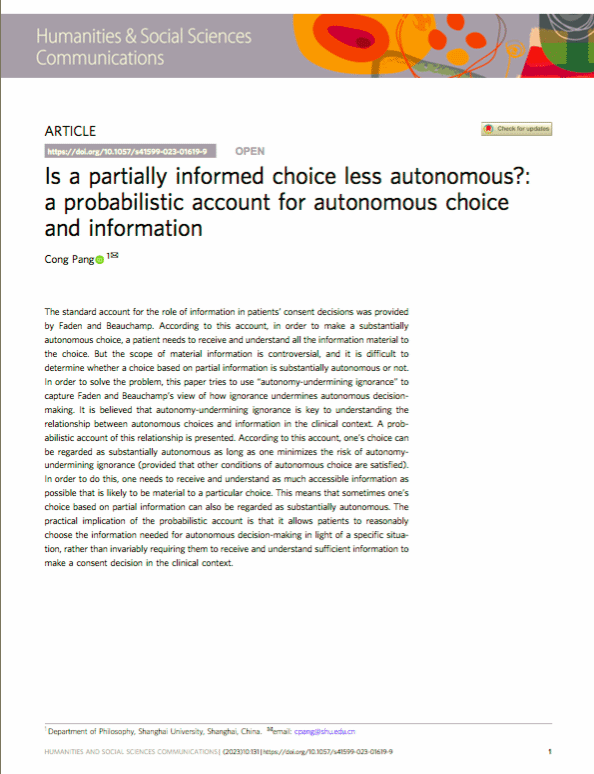 近日,上大公司哲学系青年教师庞聪在Nature子刊Humanities & Social Sciences Communications发表论文,题目为Is a partially informed choice less autonomous?: a probabilistic account for autonomous choice and information,庞聪为该论文的唯一作者。Humanities & Social Sciences Communications是Nature旗下唯一的文科综合类刊物,同时被A&HCI与SSCI收录,该刊致力于出版人文社科领域的高水平研究,在国内外的人文社科领域具有重要影响力。 该研究着眼于临床语境下的知情同意问题,从概念层面分析了信息对于自主选择的影响。文章核心观点指出,要真正促进患者自主不应过于强调全面充分的知情,而应允许患者根据其自身需求和实际情况适当地选择所需信息。本研究旨在推动临床工作者、科研人员以及相关管理者对现有知情同意规范及其具体要求的反思,同时为有关部门修订知情同意规范提供参考。 庞聪博士期间师从我国著名技术哲学家王国豫教授,从事生命伦理学领域相关研究,曾在《自然辩证法通讯》、《中国医学伦理学》、Journal of Genetic Counseling等中外学术期刊发表多篇研究成果,并被《中国社会科学文摘》全文转载1篇。 全文链接:https://www.nature.com/articles/s41599-023-01619-9 论文引用方式: Pang, C. Is a partially informed choice less autonomous?: a probabilistic account for autonomous choice and information. Humanit Soc Sci Commun 10, 131 (2023). https://doi.org/10.1057/s41599-023-01619-9