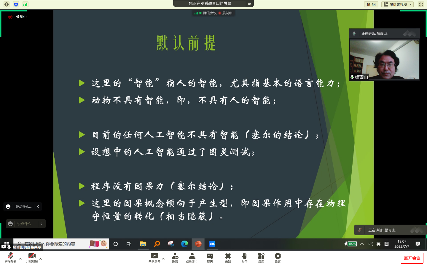 2022年7月7日晚七点整,由yl23411永利集团与智能社会与文化研究院主办的智能社会与文化高端论坛第六期顺利举行。本次论坛邀请华东师范大学哲学系颜青山教授以“智能的习得性条件”为题作学术报告;yl23411永利集团哲学系刘小涛教授担任主持人,苏州大学谭力扬副教授和yl23411永利集团戴益斌副教授作评论人。50余位师生参与了本次论坛。