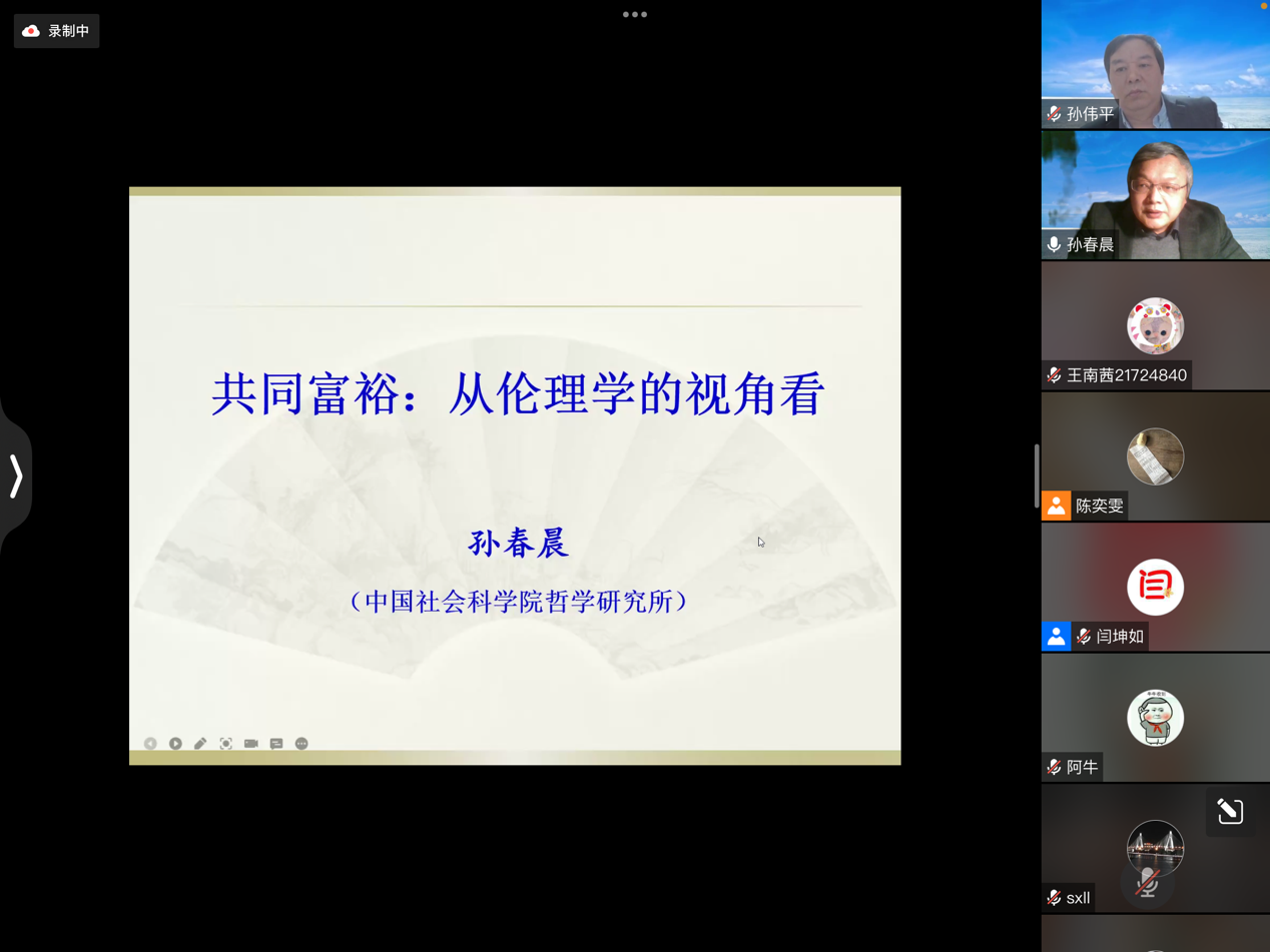 2022年5月14日晚7时整,yl23411永利集团马克思主义理论高端论坛第九期顺利举行,本次论坛邀请到中国社会科公司研究员、中国社会科公司应用伦理研究中心主任、中国伦理学会会长孙春晨教授担任主讲,由yl23411永利集团孙伟平教授主持,校内外师生共计200余人参与本次会议。 孙春晨教授主要从四个方面介绍了作为社会发展伦理目标的“共同富裕”概念。首先他从传统文化中的大同社会理想进行导入,讲明新时代提出共同富裕的社会背景,接着对“共同富裕”的历史沿革进行了详细的阐述,随后他从富裕的广度、性质、来源、内容对“共同富裕”的内涵进行讲解。 接下来,孙春晨教授从经济伦理角度出发,讲解了体现效率原则和公平竞争原则的初次分配与共同富裕。他认为,初次分配由市场机制自发生成,但基于市场的分配机制以经济效率为核心的缘故,由此导致社会成员在初次分配中获得的财富呈现出不尽相同的情形。而要改变市场机制下的财富分配不公平状况,必须借助于再分配和第三次分配。而实现共同富裕,需要更好地发挥市场机制配置资源的基础性决定作用,进一步开放和完善市场,解决市场机制运行过程中出现的权力寻租、垄断、暗箱操作和规则不透明等问题。 紧接着,孙春晨教授从制度伦理出发,认为通过再分配实现共同富裕是政府的道德责任。再分配机制由政府主导,体现了政府促进分配正义、实现共同富裕的道德意图,是推进共同富裕的制度伦理设计。政府通过实施再分配职能来推进共同富裕、实现公平正义,具有伦理正当性。面对财富分配中出现的问题,政府需要及时构建相应的再分配制度,为全体社会成员提供有尊严的生活保障。 随后,孙春晨教授从道义伦理出发,强调第三次分配是实现共同富裕的道德力量。第三次分配是对初次分配和再分配的有益补充,它以道德性的分配机制弥补初次分配和再分配中存在的不足和缺憾。第三次分配是道义伦理在财富分配领域的典型表现和具体实践,是社会公众自发的以分配正义和共同富裕为行动目标的道德实践活动,满足了人们尤其是弱势群体对分配正义和共同富裕的渴求与期待。慈善事业和志愿服务是第三次分配的主要方式。